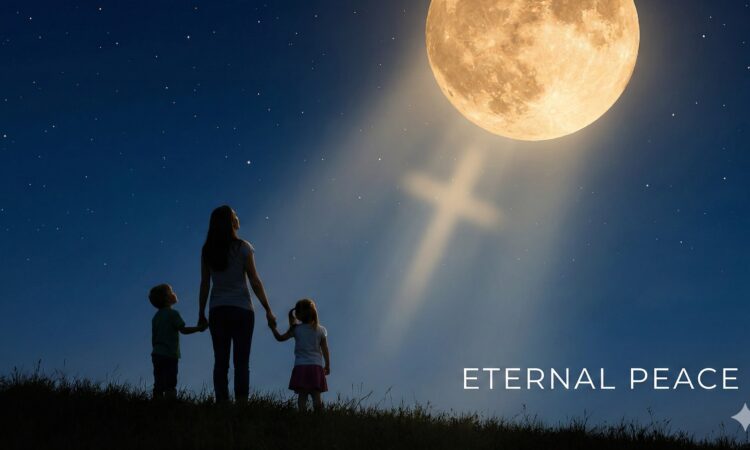 他的太太帶著兩個幼兒,在中秋夜仰望天際,看著今年不一樣的明月,向在天家的爸爸說再見!此情此景,看似悲哀,但並非絕望,托住他們的是真正的「平安」。