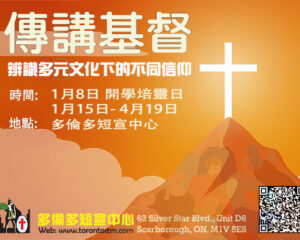 1月11日至3月22日 (逢星期六) *** 視像和實體上課與佈道同時進行 *** 時間 :上午10:00 至下午3:00 實體上課地點:多倫多短宣中心 (63 Silver Star Blvd,unit D6, S